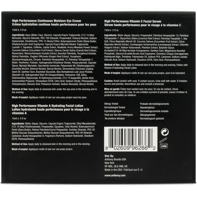 Anthony High Performance Trio Kit. Includes Eye Cream (0.5 Fl Oz), Vitamin C Facial Serum (0.5 Fl Oz), and Vitamin A Hydrating Facial Lotion (0.5 Fl Oz). Anti-Aging Powerful Trio for All Skin Types