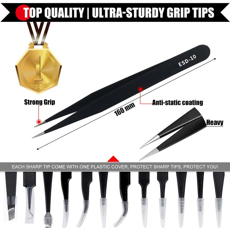 - Grab hold of whatever you want! This multifunctional tweezers set has 12 types of tweezers, which suit for Electronics Repair, Craft, Jewelry, Soldering, Lab work, Model making, Stamp or coin collecting, Weeding vinyl design, Ingrown hair removal, Eyelash extension, Eyebrow removal, Paper Sculptures, Embroidery, Phone repair, Watch repair, Cameo, Diamond Painting, eyeglass, apparatus, etc.