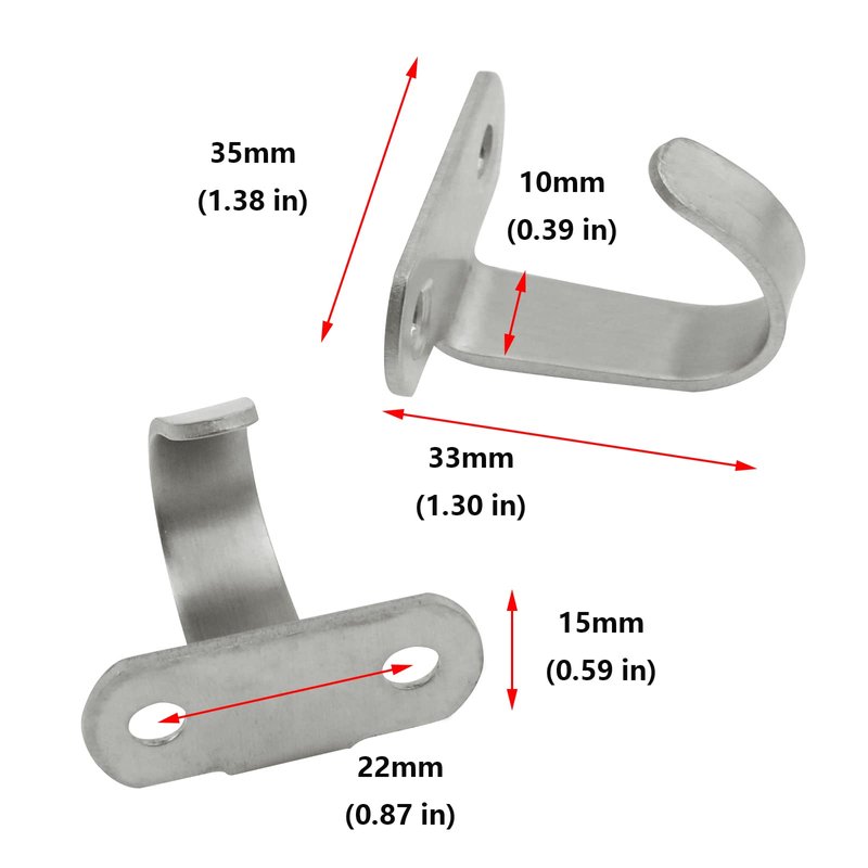 - Mounting Hole Distance: 0.9"; Hole Diameter: 5mm/0.2";Thickness: 1.5mm; Hook Shaft Dia: 10mm/0.4"; Safe working load of 20 pounds.