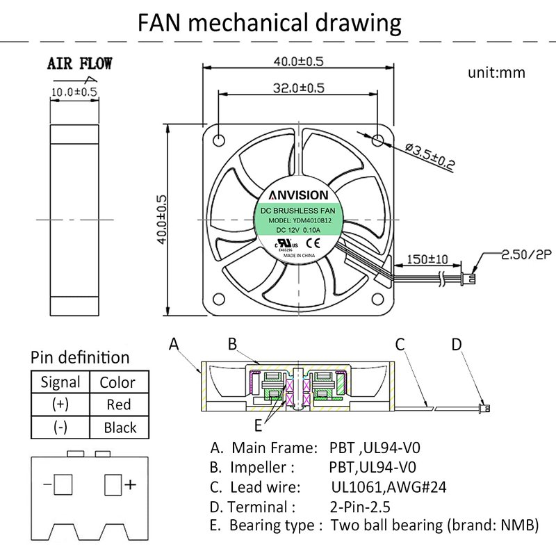 Dimension: 40*40*10mm Housing: Black PBT (UL94V-0) Fan Blade: 7 Blades, Black PBT (UL94V-0) Bearing System: Two Ball Bearings Net Weight: 13.7g Rated Voltage: 12V DC Operating Voltage Range: 10.8-13.2V DC Start-up Voltage: 6.0V DC Rated Current: 0.04A (0.10A Max.) Rated Power: 0.48W (1.2W Max.) Rated Speed: 6200PRM Air Flow: 7.56CFM Air Pressure: 3.19mmH2O *Noise Level: 27.50dB(A) Lift Expectancy: 50000H at 25degree test *Acoustical Noise Testing Condition: Fan is hanged in anechoic chamber, noise is measured at rated voltage in anechoic chamber with microphone at a distance of 1 meter formthe air intake.