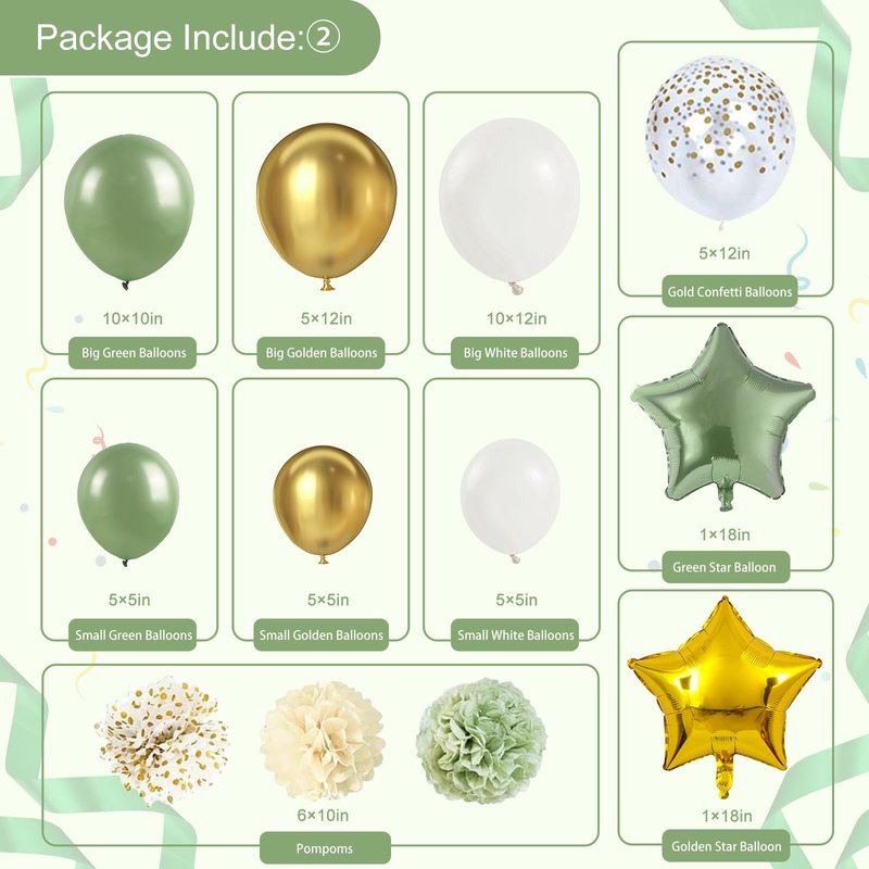 - [SAGE GREEN BIRTHDAY PARTY DECORATIONS]- 68Pcs. Including 1pc white “HAPPY BIRTHDAY“ banner, 1pc gold foil polka dot tablecloth, 10pcs cake toppers, 25pcs 12inches latex balloons, and 15pcs 5inches latex balloons (including green, gold and white), 5pcs 12inches gold confetti balloons, 6pcs pompoms, 1pc 18inches green star balloon, 1pc 18inches golden star balloon, 2pcs balloon glue and 1pc white ribbon.