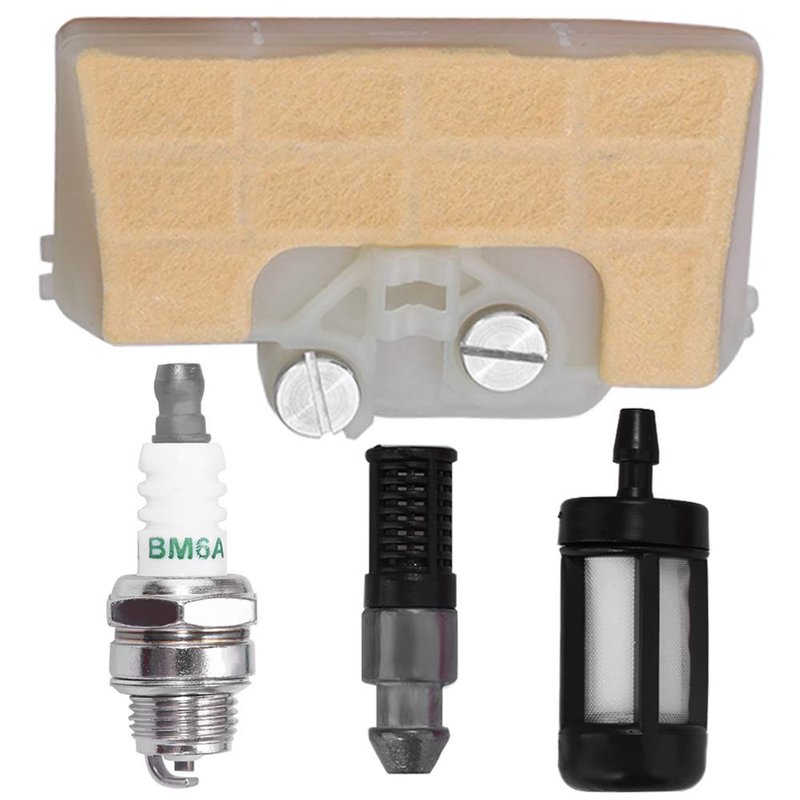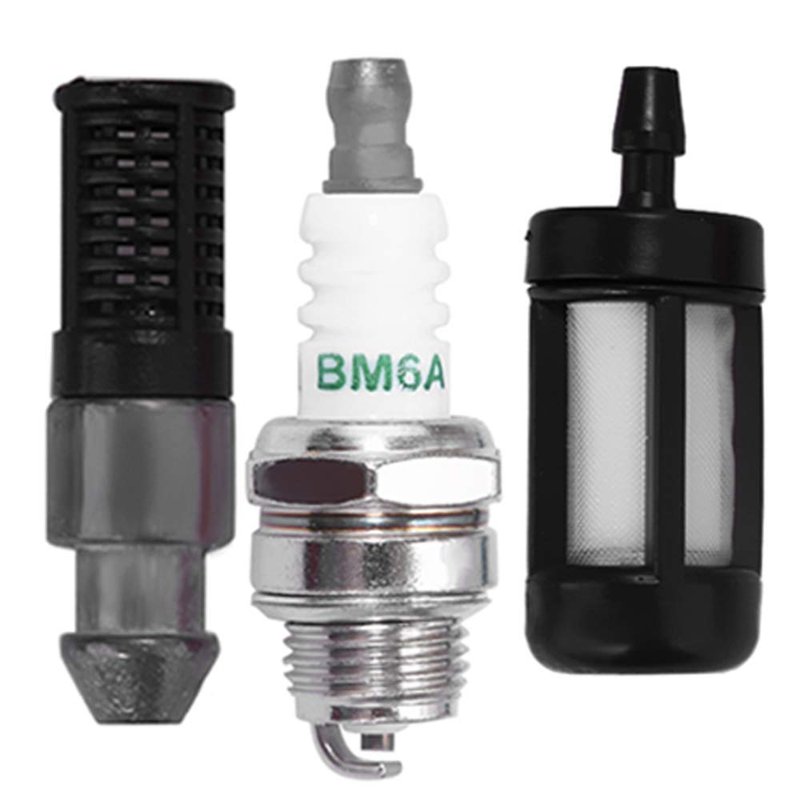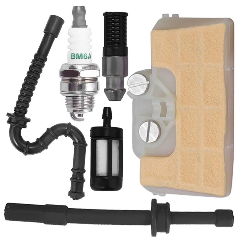 - Package includes: 1x air filter, 1x spark plug, 1x fuel line, 1x filter, 1x oil line, 1x oil filter