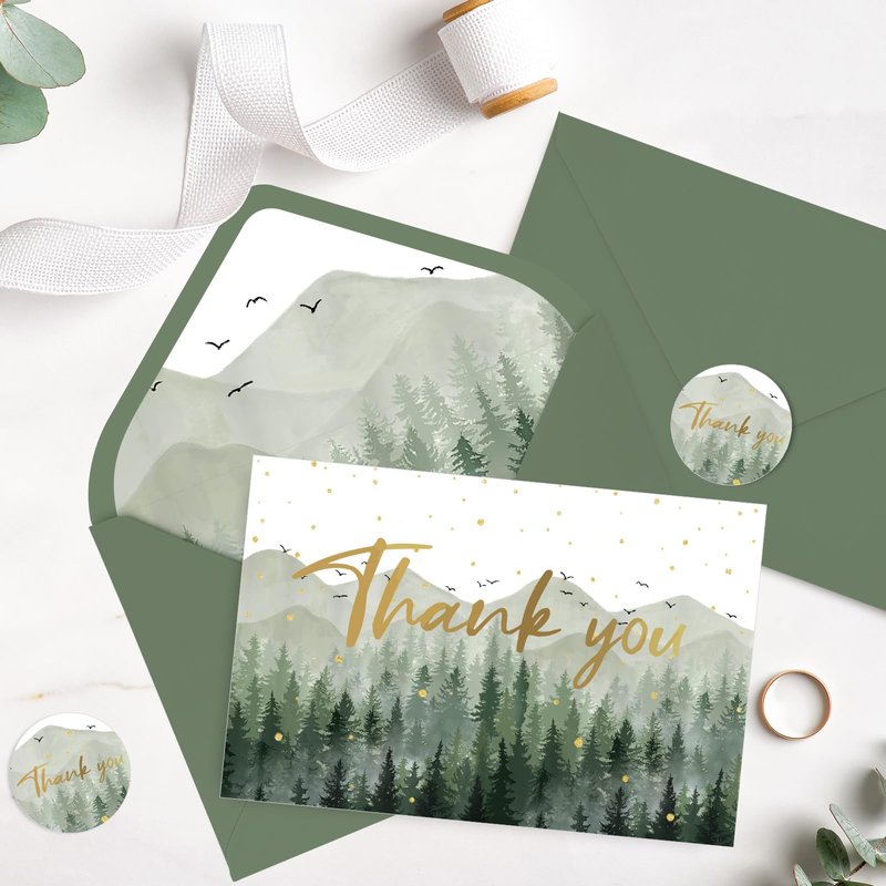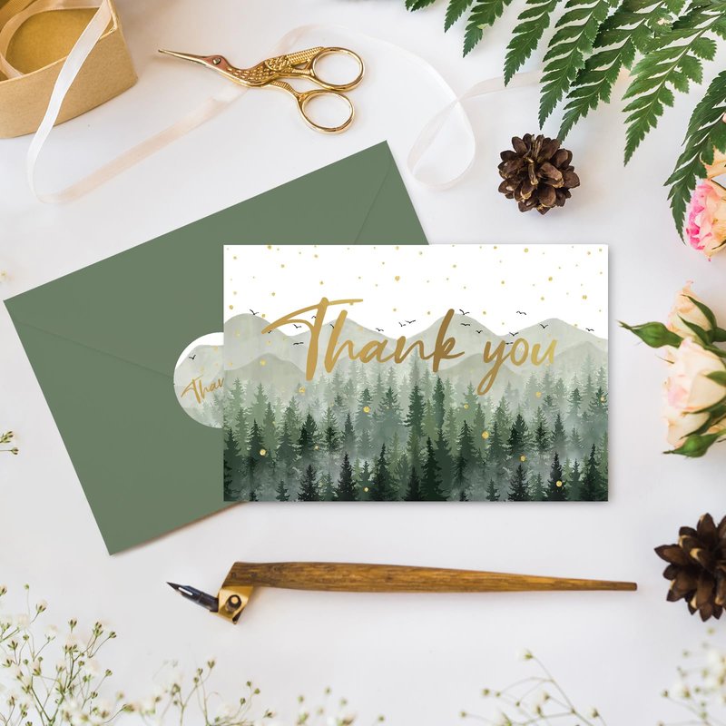 - FOREST DESIGN: Patterned with forest, printed with gold foil Thank you words, fresh and delicate, suitable for many occasions.
