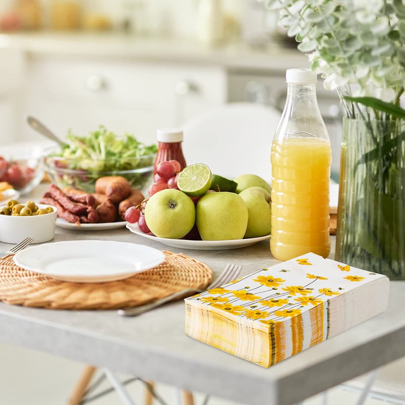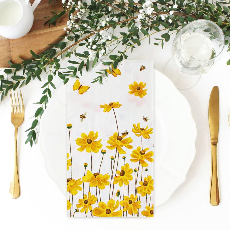 Features: Elegant design: 80 sheets guest napkins, patterned with exquisite yellow flowers, bees and butterfly, special and beautiful, suitable for many occasions. Great table supplies: Our hand wiping napkins are in proper size, which makes your holiday party tabletop clean and more fun with this set of decorative napkins, perfect for holiday celebrations, dining. Specifications: Material: paper Size: 13 x 15.7 inch Package include: 80 x Paper Guest Napkin