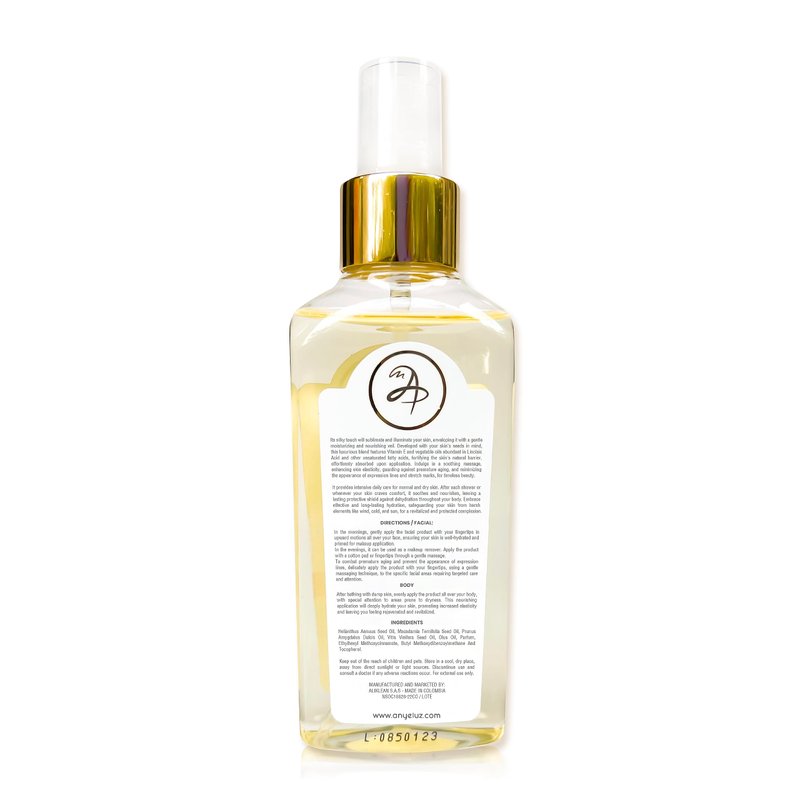 Discover the wonderful Anyeluz Anti-Aging Oil! Our Anti-Aging Oil is an exceptional product that combines vitamin E and oils rich in linoleic acid and other unsaturated fatty acids. This powerful formula strengthens the skin's natural barrier function, providing anti-aging benefits for a more youthful and radiant appearance. When applying Anyeluz Anti-Aging Oil, you will experience rapid absorption and a light skin feel. With just a normal massage, you will improve skin elasticity and help prevent premature aging, fine lines and stretch marks.Vitamin E, known for its antioxidant properties, protects the skin from free radical damage and promotes cell regeneration. Oils rich in linoleic acid and other unsaturated fatty acids provide deep hydration, nourishment and smoothness to the skin, leaving it looking healthy and rejuvenated.