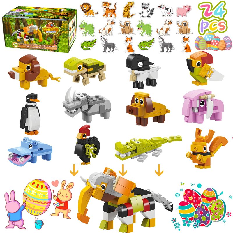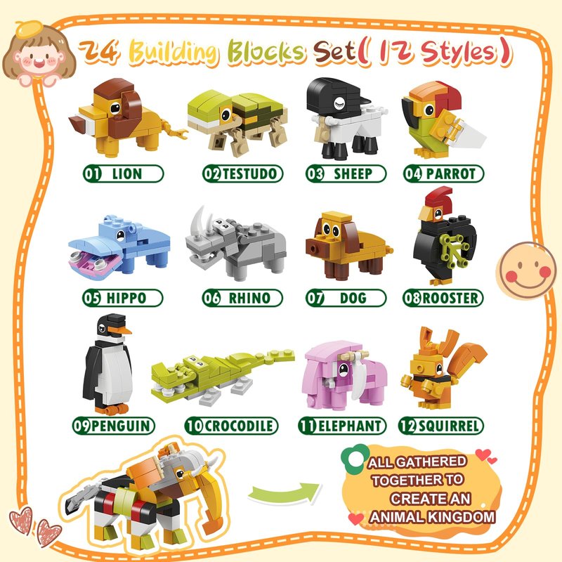 - Valentines Day gifts for kids:Our Valentines day gifts set have 24PCS animal building blocks, 24PCS kids valentines cards, 24PCS valentines day stickers, 24 cute OPP bags & twist tie * 24