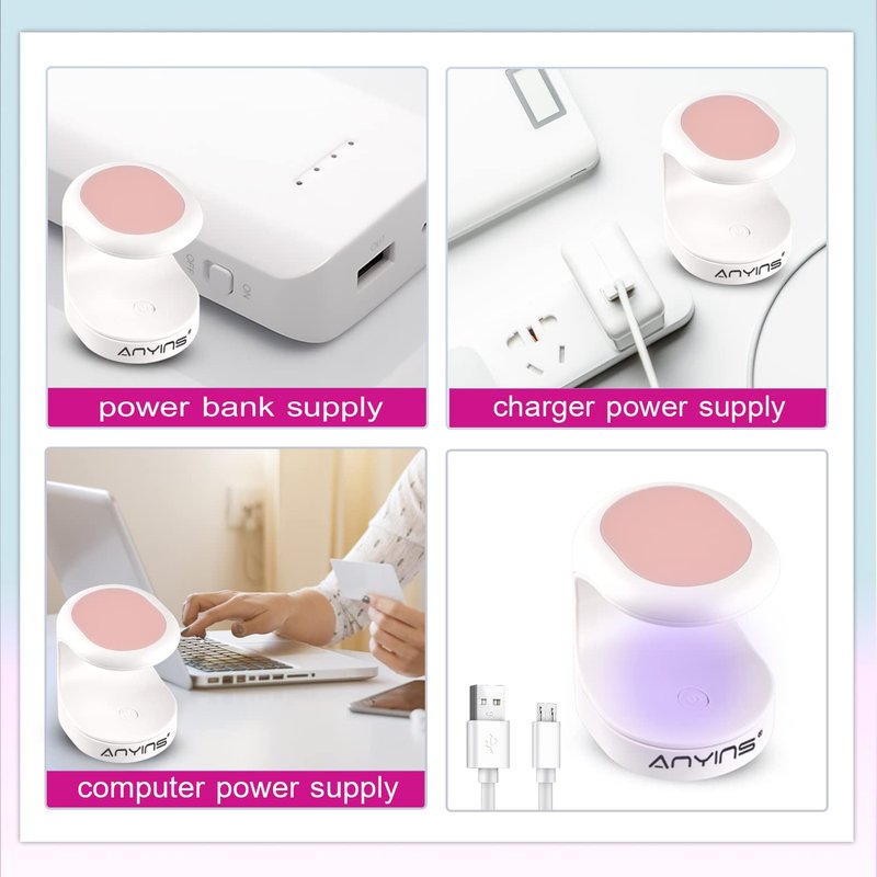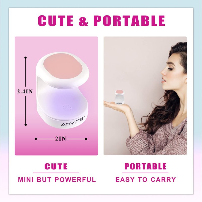 ANYINS Colors Mini UV Led Nail Lamp(Pink) Features:-It's perfectly for curing one finger one time. This desing of nail lmap can evenly cure many kinds of nail tips, even short nail tips, middle nail tips or long nail tips and no dead zone. There is a timer setting, one time is 60s. This uv led nail lamp can quickly cure all types of gel nail polish. Without limitations of space or time.-Mini design, whether it's a business trip, or travel. You can carry around without any pressure. So you can have a manicure feast anytime, anywhere. At the same time, it is very convenient to use. You can use the USB interface, and the power bank can meet your needs.-Suitable for nail salons and DIY nail art at home, great gift for mother, sisters,daughter or girlfriend who love manicure. Specifications:Type:Mini UV Led Nail LampColor:PinkMaterial: PlasticQuantity:1 nail lamp and 1 usb cable Size:2in*2.4in*2.4in Application: 1.File your nails and cleaning up dust better with alcohol nail wipes; 2.Apply appropriate nail glue on nail tips and press firmly on your own nails; 3.Open mini uv led nail lamp and cure 60s; 4.Shape your nail tips what you like; 5. Apply nail polish gel on nail tips; 6.Cure under mini uv led nail lamp for 60-90s again; 7.Done.