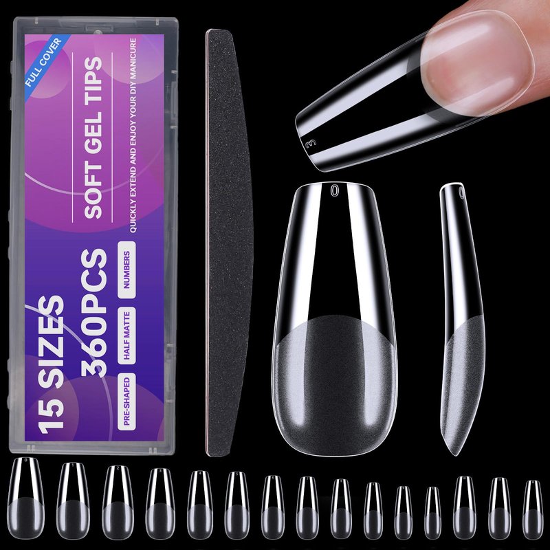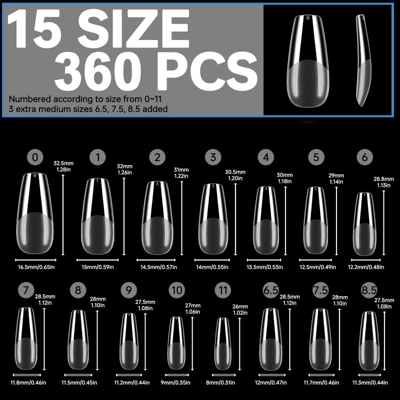 - 【360 pieces in 15 sizes to find the perfect fit nails】We have prepared a total of 360 pieces in 15 sizes, numbered according to the nail tips coffin sizes from 0 to 11 and added 3 medium sizes (6.5, 7.5, 8.5).