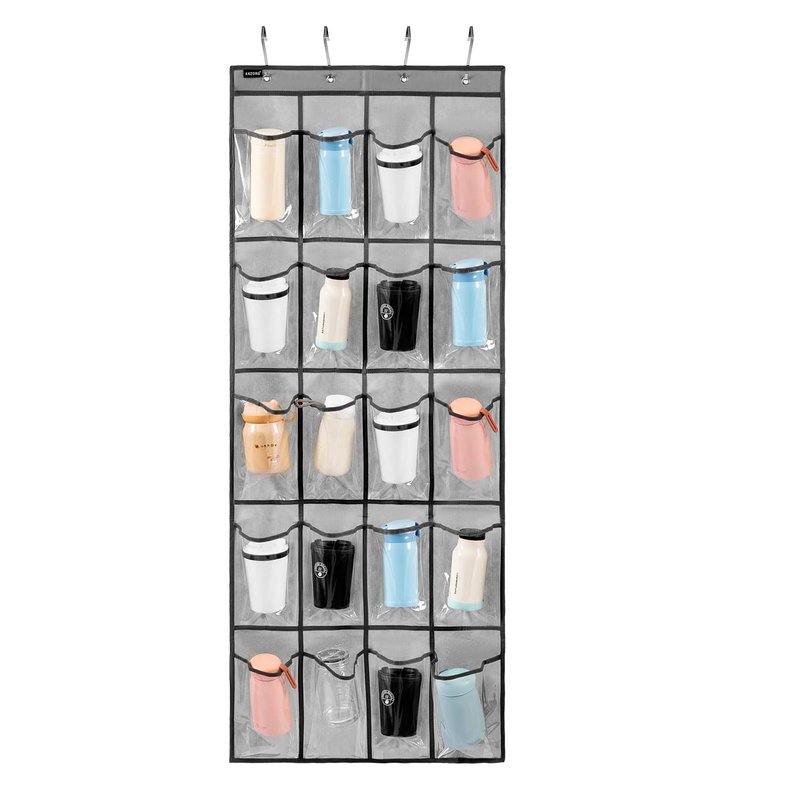ANZORG Over Door Hanging Water Bottle Holder Cup Organizer for Kitchen Pantry Glass Bottle Storage Rack with 20 Pockets (CLEAR PVC POCKETS)
