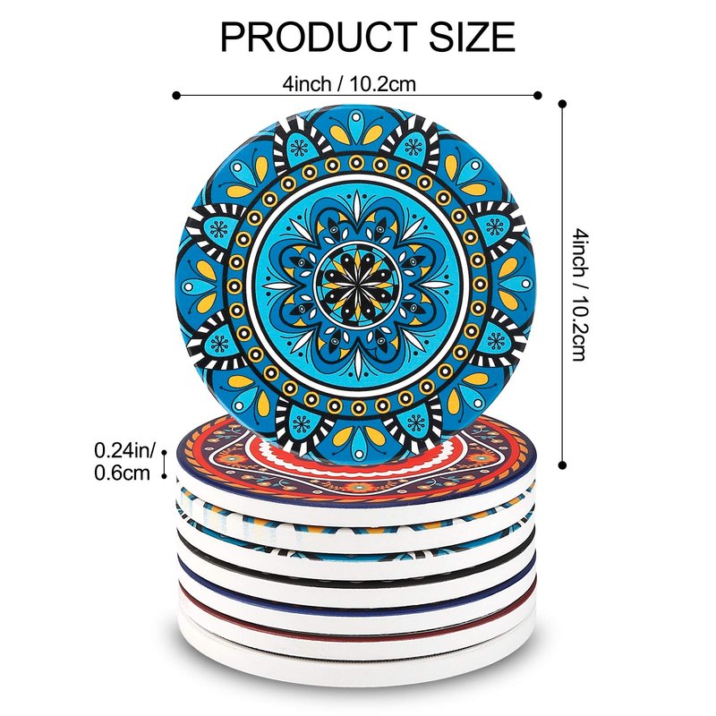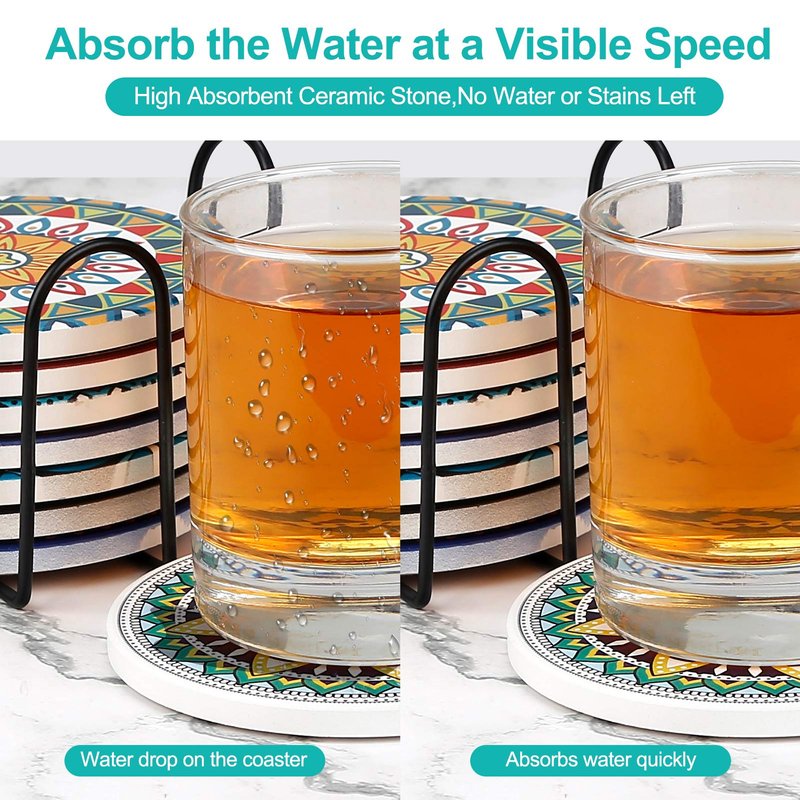 - 🍷COMPLETE SET: This AODINI coasters set includes 8 ceramic stone coasters in different mandala styles AND a black iron coaster holder. The coaster holder will storage your coasters and save the space.