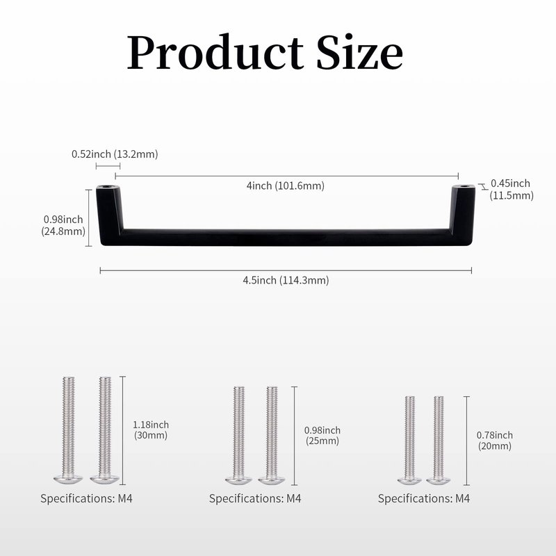 BY EMPLOYING BRAND LOVELY CABINET DOOR HANDLES FOR THE KITCHEN, YOU MAY INFUSE MORE LIFE INTO YOUR HOME. WHY CHOOSE BRAND STAINLESS STEEL CABINET PULLS? IDEAL HOME DECORATION No matter what style you want, the stainless steel cabinet door pulls are suitable for use with a variety of different types of furniture décor. QUICK & EASY INSTALLATION Everything you need for installation is included, so all you have to do is attach the knobs to your cabinets with the two pairs of screws included. WIDELY APPLICABLE Kitchen, bathroom, office, living room and other areas. Everyone who has tried them so far has raved about them, and we are confident that you will enjoy them as well! INSTALLATION STEPS 1. Use a 4mm drill bit to drill the screw holes in the board 2. Choose a suitable screw, the screws go through the board and align the screw holes of the cabinet doorknobs. 3. Use a screwdriver to tighten the screws on the back of the board 4. Cabinet knobs installed. SPECIFICATION Material: Environmentally friendly zinc alloy Color Option: Matt Black Size: 4.5 inch Hole Size:4 inchcenter hole spacing Screw length: 20MM,25MM,30MM. PACKAGE INCLUDES 6 x Chrome finishcabinet handles 36x screws 12pcs X20mm,12pcs X25mm,12pcs X30mm WARM TIPS: 1) If you have cabinet doors or drawer boards that are different in thickness, please measure them before purchase. 2) Due to variations in lighting and screen settings, the actual color of the item may appear somewhat different from the photographs. Your satisfaction is our number one priority. Please do not hesitate to get in touch with us if you have any questions. We will respond to your message within one business day.