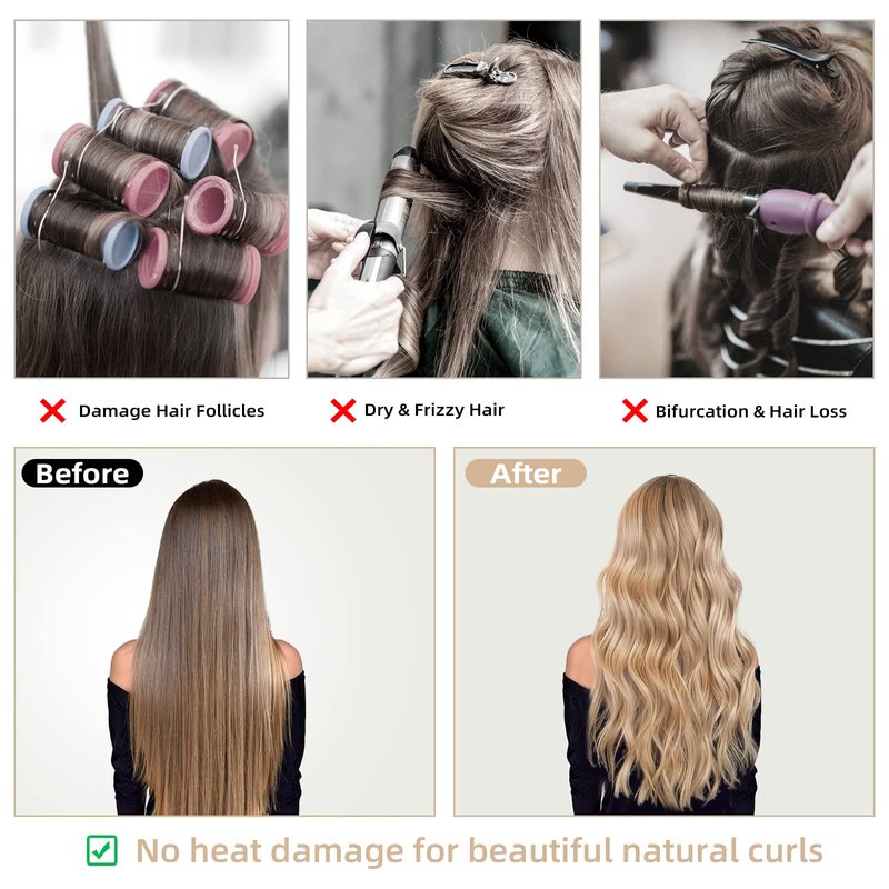 - 【Hair Curler】 No need to heat your hair, this perfect curling iron replaces traditional hot curling irons and other harsh curling irons to achieve heat-free curls and avoid heat damage to your hair. Say goodbye to breakage and split ends and say hello to healthy hair!