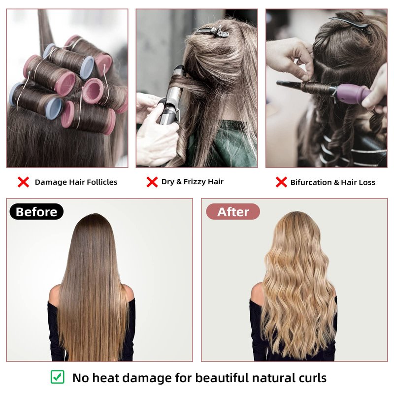 - 【Hair Curler】 No need to heat your hair, this perfect curling iron replaces traditional hot curling irons and other harsh curling irons to achieve heat-free curls and avoid heat damage to your hair. Say goodbye to breakage and split ends and say hello to healthy hair!