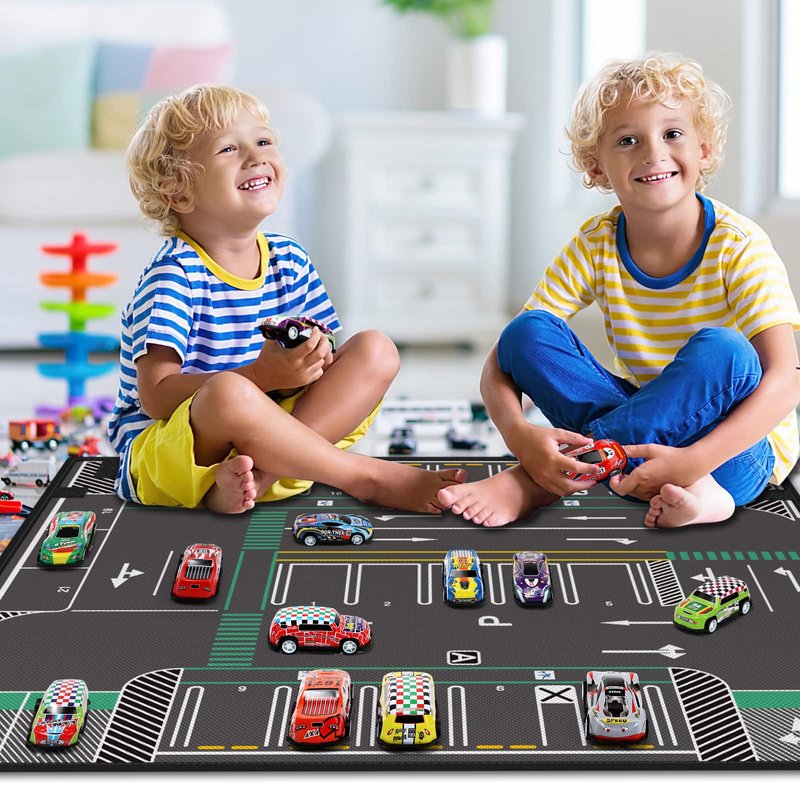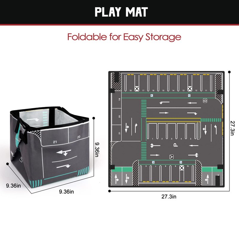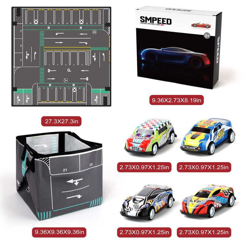 - [Convenient Storage Parking Lot Map] - Compared with other product, our metal race car sets toy comes with a large parking lot play mat.Provide children with a realistic parking lot scene and pretend that they are shuttle in it.When your little one ends his fun playtime, fold up the map and turn it into a tote bag to store all the toys in, or take the bag with you wherever you want.