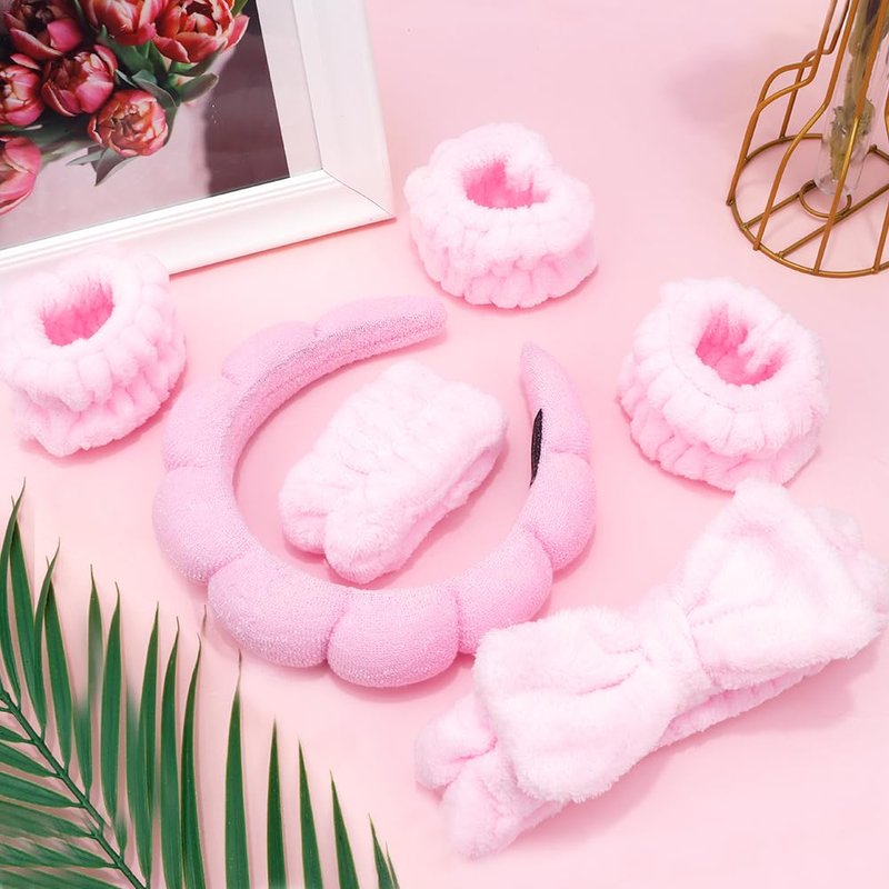 AOPRIE SPA Headbands for Washing Face Makeup Headbands with Bow Hair Band Women Facial Head Band Wrist Towel Wraps For Shower Face Mask Pink, 6 Pack