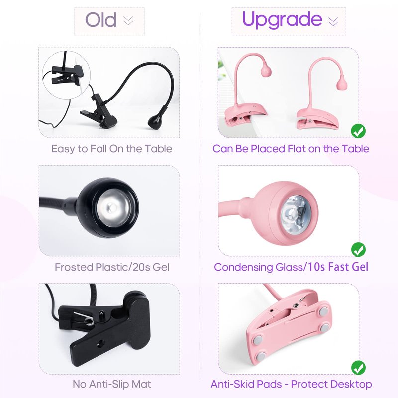 - 【Freely Fixed】: AORAEM flash cure light for nails with the flexible clip, fixing to the bedside table, office desk, laptop desk, headboard, etc. Gel nail light can also be fixed on the desktop, the base is stable and not easy to fall. A variety of ways to meet your different need.