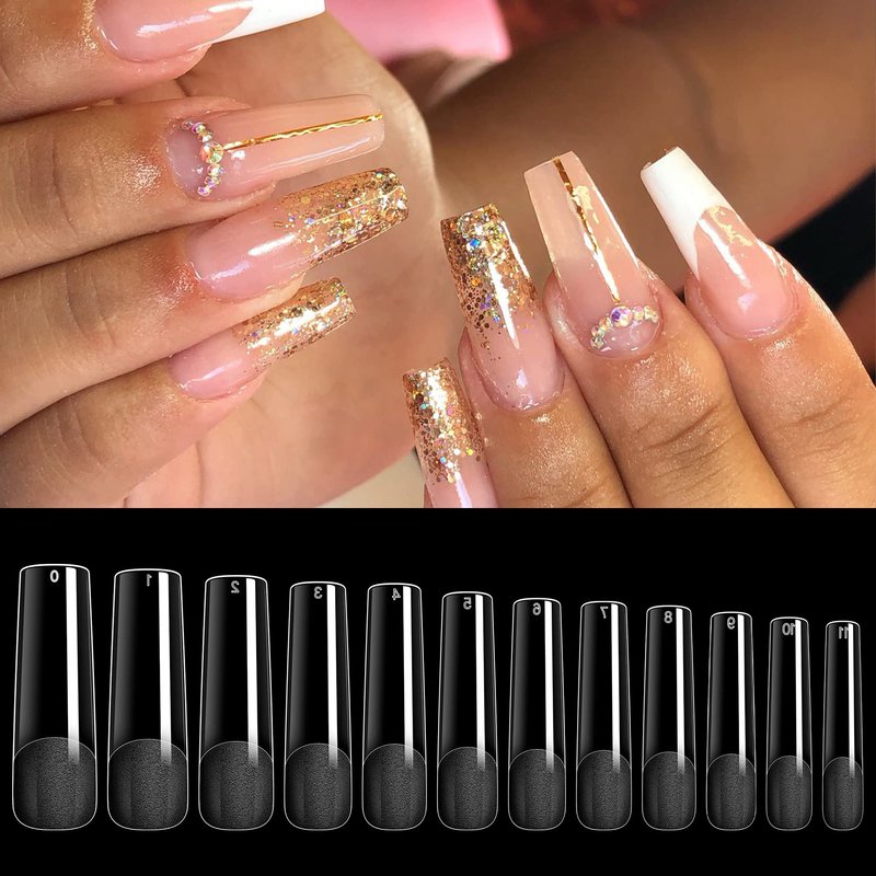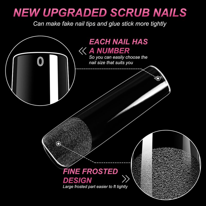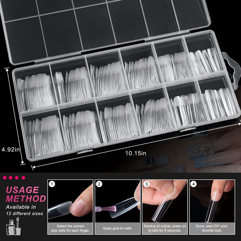 - FULL COVER HALF MATTE NAIL TIPS- Square long nail tips is more friendly, There is no need to scrub the nail bed before getting a manicure, which will not wear our nail bed or make our nail bed ugly. Full cover press on nail tips is more convenient for Professional technicians,saving time;clear nail tips are easy to trim, paint and apply and hold the color gel polish well without separating or streaking. Pairing up paint and colorful decoration,your nail tips art could be more natural.