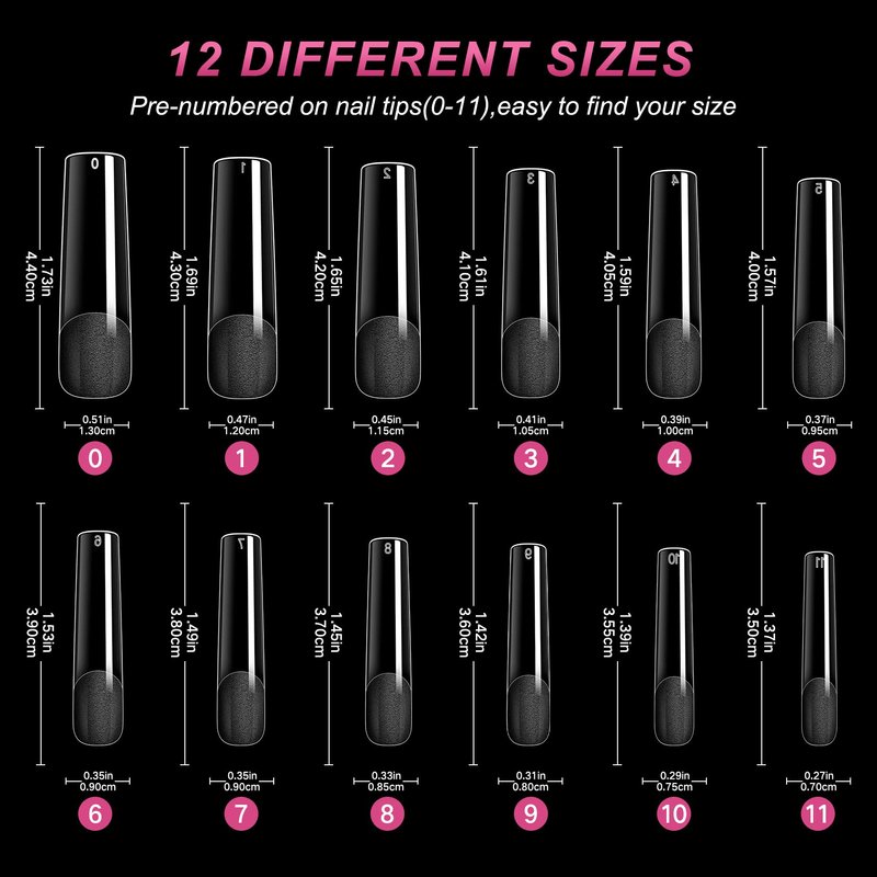 - VARIOUS SIZE-There are 240PCS clear coffin nails tips in the package, offers 11 different sizes with 10 nails of each size numbered 0-10 individually, it is convenient to choose the most fit size to your finger. Pre-shaped nails save professionals time and are beginner friendly,Make it easy for you to get a satisfying nails at home.