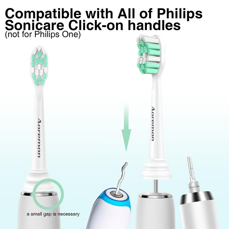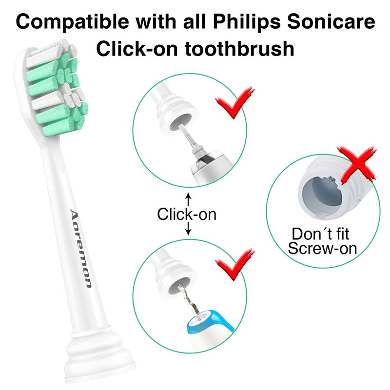 - Wide Compatibility- Aoremon brush heads are fit perfectly with all Phillips Sonicare(Snap-On System) toothbrush handle except Philips one and Essence. Simply click on and off for easy replacement(specific models have attached below)