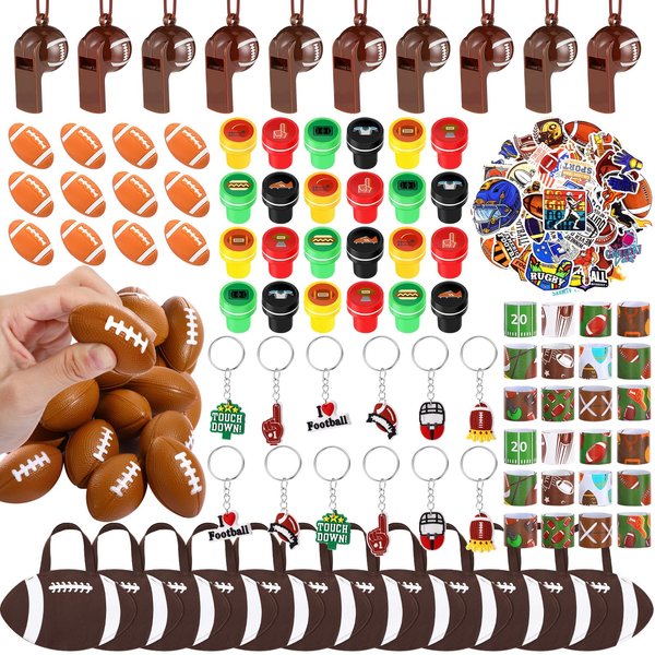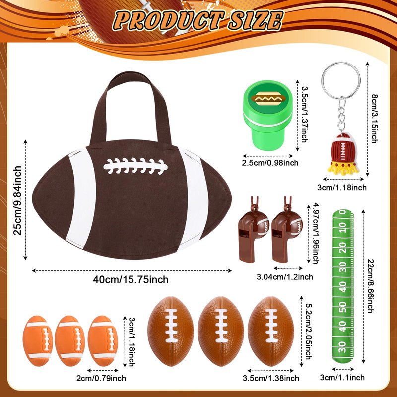 - Football Goodie Bags Favors: the package includes 24 pcs of football slap bracelets, 24 pcs of football stampers, 12 pcs of mini bouncy football, 12 pcs of football keychains, 12 pcs of football non woven gift bags, 50 pcs of football stickers, 12 pcs of football erasers and 12 pcs of football whistles, the thoughtful set will save much of your energy and time