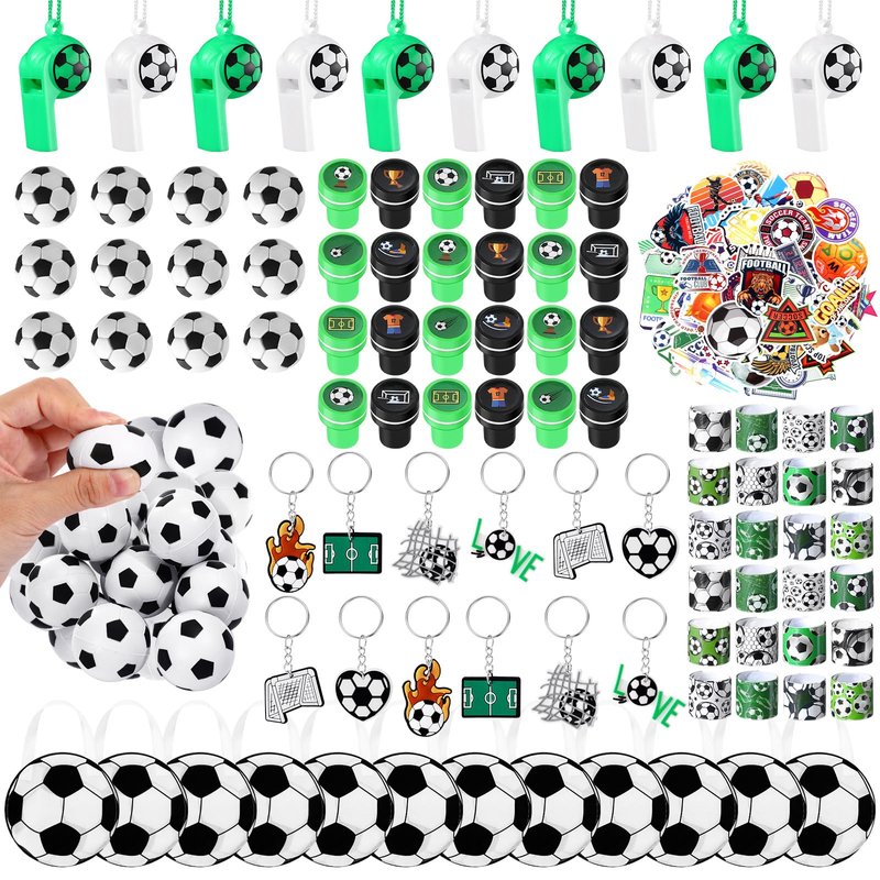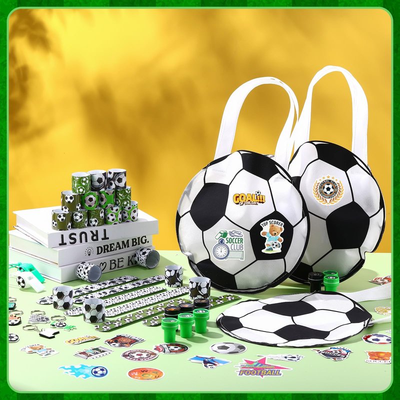 - soccer Goodie Bags Favors: the package includes 24 pcs of soccer slap bracelets, 24 pcs of soccer stampers, 12 pcs of mini bouncy soccer, 12 pcs of soccer keychains, 12 pcs of soccer non woven gift bags, 50 pcs of soccer stickers, 12 pcs of soccer erasers and 12 pcs of soccer whistles, the thoughtful set will save much of your energy and time