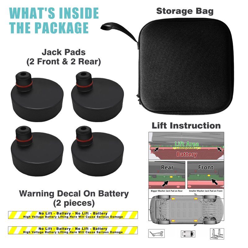 - Size Details: Our product includes 2* Lifting Warning Decal, 1* Jack Instruction, 2 pairs of jack pads. The bigger washer jack pad is for the rear and the smaller washer jack pad is for the front. Please check the size and choose the proper position before using it.