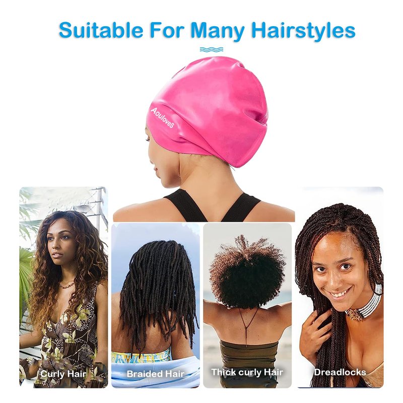 - Designed for Your Long Hair - Our large swim caps are ideal for those with long hair past the shoulders, including dreadlocks, weaves, hair extensions, braids, curls and afros. This swimming hat is easy to put on and take off without snagging your hair.
