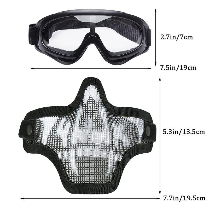 - Package includes: 1 x Steel Mesh Mask for Halloween, 1 x Tactical Goggles. Material:Airsoft Mask:Low-carbon steel and 1000D Nylon. Goggles : TPU+PC.