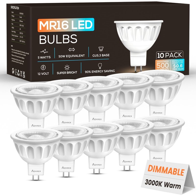 Aovpex 10 Pack Dimmable MR16 LED Bulbs, 12V 5W(50-Watt Equivalent), 3000K Warm White, GU5.3 Bi-Pin Base, 40-Degree, Indoor/Outdoor Landscape Spotlight Track Recessed Lighting