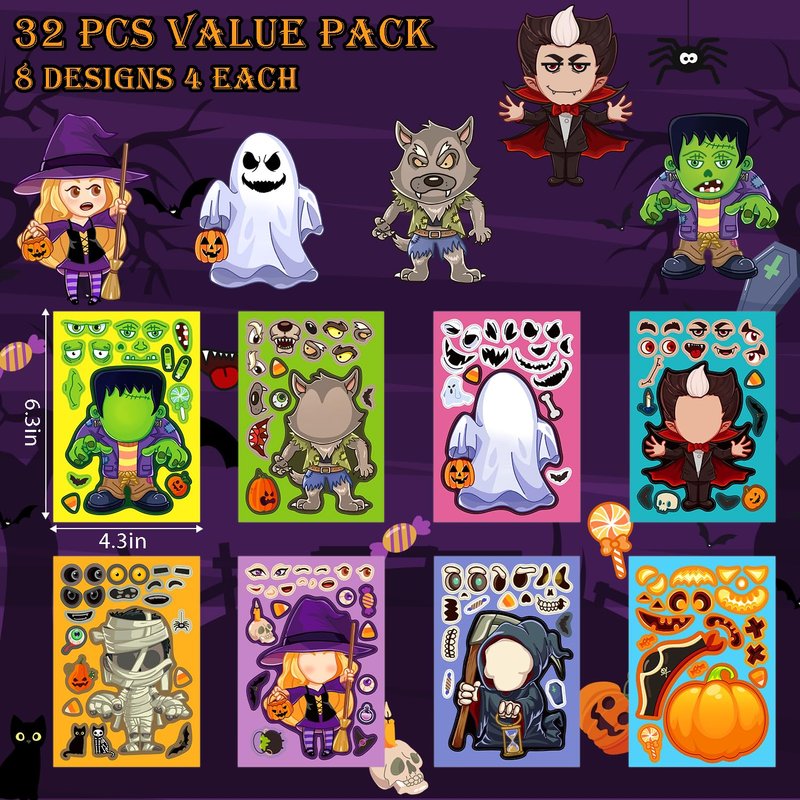Aowplc 32 Sheets Halloween Stickers for Kids Make a Face Halloween Characters Stickers Halloween Kids Party Favors Crafts Game Activities Supplies
