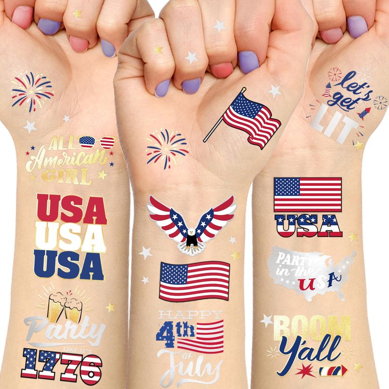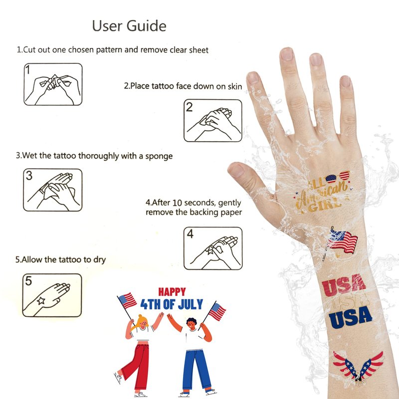 - Add Patriotic Atmosphere : Our July 4th patriotic temporary tattoos can be stuck well on your arm, face, shoulder, lower back, leg, hand, neck, wrist, ankle or anywhere you like. Enhance the festive atmosphere and express patriotism with family and friends.