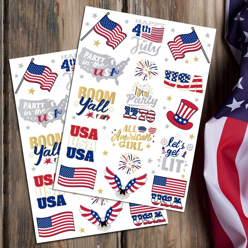 - Independence Day Theme : Our Fourth of July temporary tattoos are included different Patriotic elements designs: American flags, flags of various shapes, stars, hats,1776 Let's get LIT All American girl etc. Our temporary tattoos add more adorable adornments for your party, making your kids happier. It is very suitable for sharing with family, children and friends.