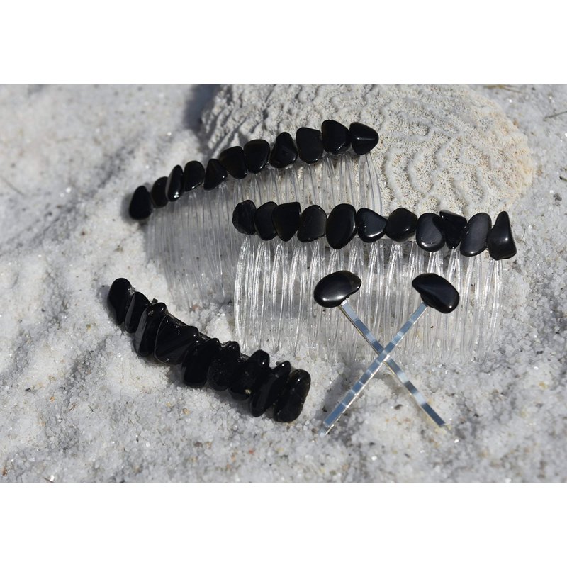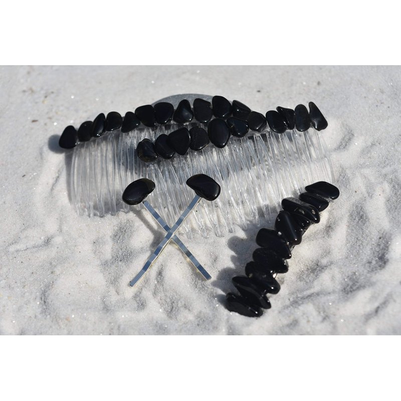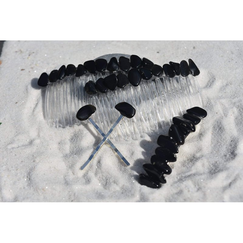 Beautiful apache tears stones a lovely set of hair jewelry. The matching set includes: a pair of hair combs, a french barrette, and two hair pins. The tumbled apache tears stones adorns a silver metal French barrette, a set of acrylic hair combs, and two metal bobby pins,. The matching set of hair jewelry is perfect for a recital, wedding or special occasion or they can be simply enjoyed with casual wear. The hair jewelry is handmade; each stone was carefully selected for its color to create a stunning design in a brilliant colors. The hair clips are made in the USA and from a smoke free environment. The set includes: 2 - Hair Combs 1 - 60 mm French Barrette 2 - Hair Pins