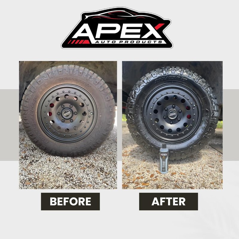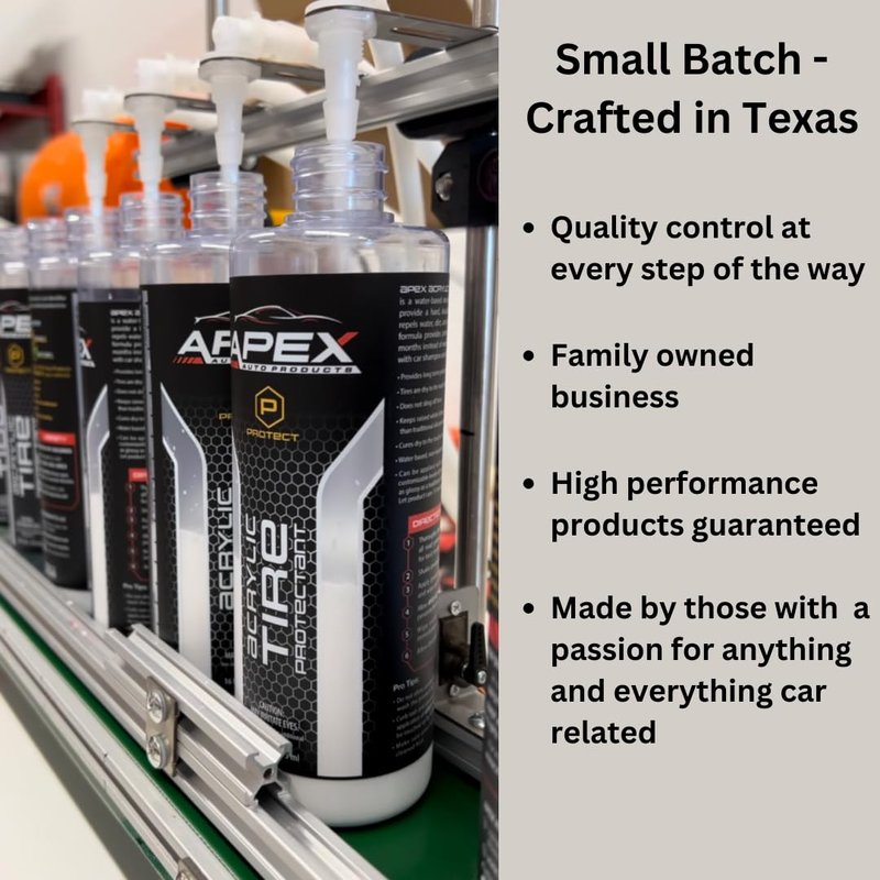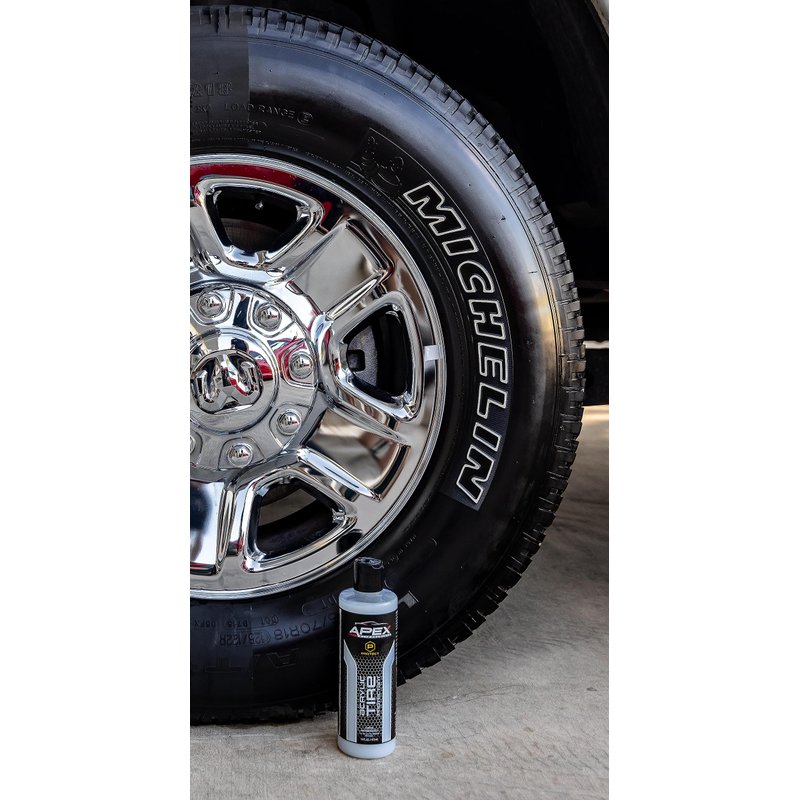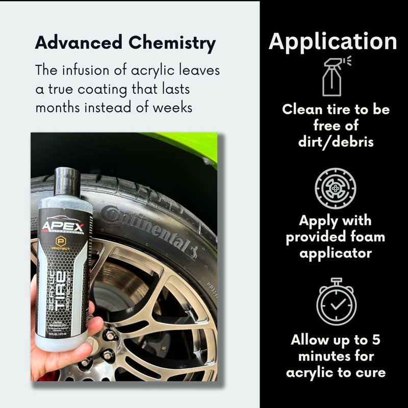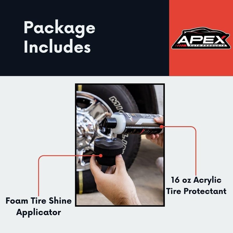 Elevate your vehicle's appearance with the power of Apex Acrylic Tire Shine & Protectant. Made in America and designed by those in the automotive industry, this protective tire shine comes in a size double that of competitors. Apex Acrylic Tire Shine & Protectant brings forth a high glossy shine that not only looks great, but provides a strong barrier of protection as well. Using advanced acrylic technology, it acts as a durable coating against the sun's UV rays, the wear and tear of road debris, and the harsh impact of environmental contaminants. It will keep your tires from continuing to oxidize and turning brown. With its user-friendly application, you can achieve a smooth, even coat that lasts wash after wash for months. Simply pour a few drops on the included free foam applicator and wipe on. Built on Apex Auto Products' legacy of quality, this tire protectant establishes a new benchmark for tire care. But that's not all – here's why Apex Acrylic Tire Protectant is the ultimate choice for car enthusiasts and everyday drivers: **Long-Lasting Shine:** While many tire shines fade quickly, Apex Acrylic Tire Protectant's glossy finish endures, keeping your tires looking stunning month after month. **UV Defense:** Protect your tires from harmful UV rays that cause fading, cracking, and aging. Our USA made and manufactured acrylic is like a durable and long lasting sunscreen with no greasiness for your tires. **Oxidation Prevention:** Say goodbye to brown, oxidized tires. Apex Acrylic Tire Protectant stops the oxidation process in its tracks, preserving your tires', dark black appearance. Keeping tires in top-notch condition, while resisting damage and deterioration **User-Friendly:** Applying the protectant is a breeze. Just a few drops on the free applicator, a quick wipe, and you're done. No mess, no hassle, only great results.