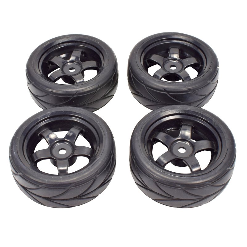 - 4 Premounted Rubber Sedan Wheels / Tires - These Will NOT Work On 1/10 Trucks Or Buggies