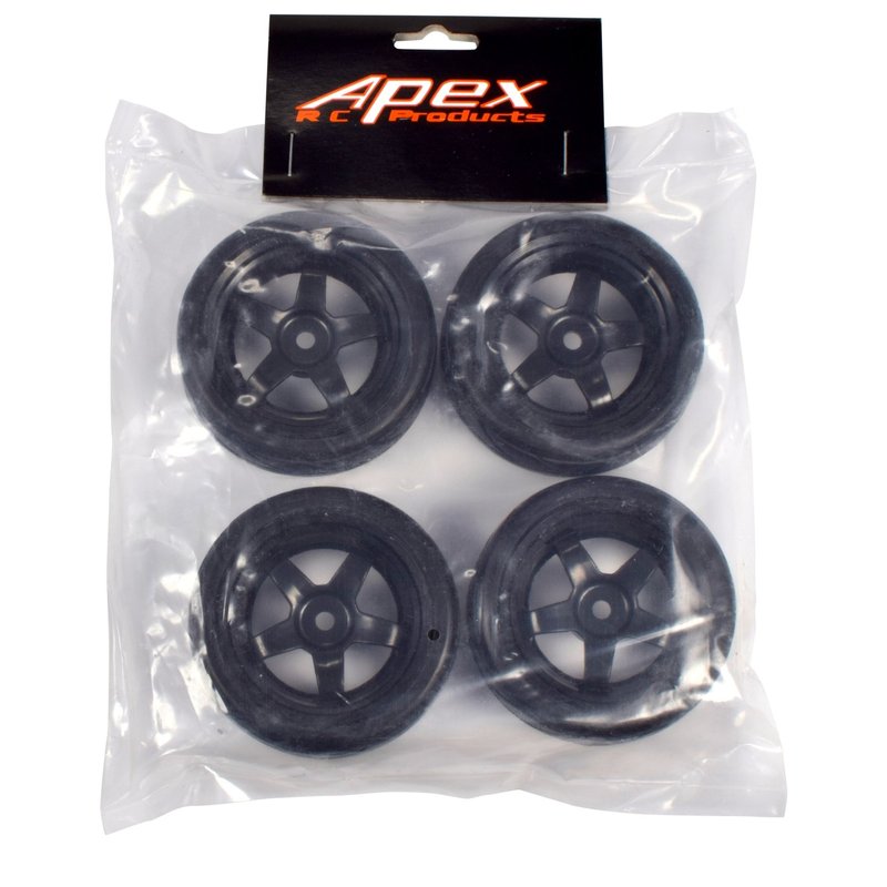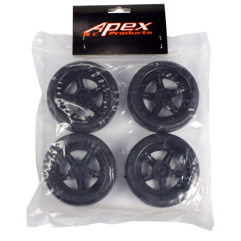 Apex RC Products 1/10 On-Road 12mm Black 5 Spoke Wheels V Tread Rubber Tires (Set of 4) #5000