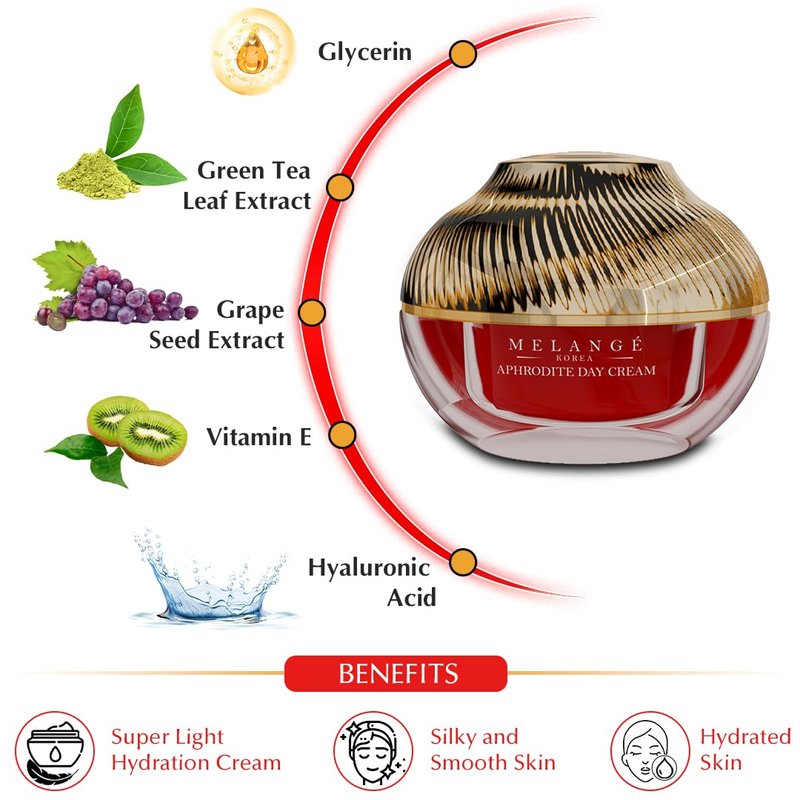 Enrich and moisturize your skin throughout the day with our luxurious MELANGÉ Aphrodite Day Cream. This meticulously crafted day cream features a highly concentrated, power-packed formula steeped in Green Tea Leaf Extract and Grape Seed Extract. These remarkable ingredients work hand in hand to hydrate, nourish, and restore your skin, leaving it looking noticeably more vibrant and full of life. Designed for daily use, the MELANGÉ Aphrodite Day Cream acts as a formidable ally against skin stressors. It works diligently to maintain your skin's youthful vitality and resilience, promoting a balanced, nourished, and rejuvenated complexion. With each application, your skin absorbs the cream's nourishing ingredients, revealing an ever-more radiant and vibrant you.