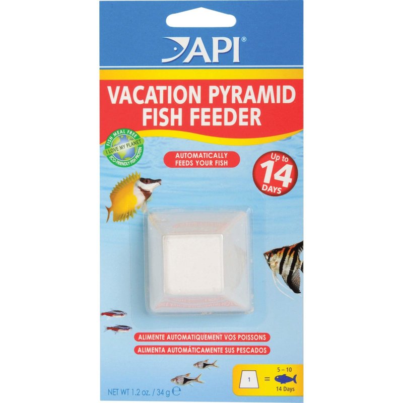- Contains one (1) API VACATION PYRAMID FISH FEEDER 14-Day 1.2-Ounce Automatic Fish Feeder