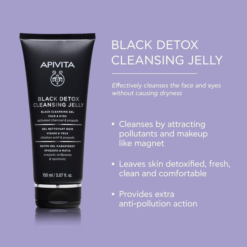 APIVITA's Black Detox Cleansing Jelly is more than just a facial cleanser. This rich, creamy formula is designed to gently cleanse your skin while maintaining its natural moisture. Free from sulphates and enriched with propolis extract and soap, it washes away impurities without drying your skin. Thyme honey and panthenol provide intense hydration, leaving your skin soft and supple after each use. Olive and almond oil nourish your skin thoroughly, promoting a healthy glow. The product also contains calendula, known for its soothing properties and ability to prevent irritation. Organic orange and rose essential oils provide additional moisturizing and antioxidant properties, protecting your skin from environmental stressors. The unique scent with notes of thyme honey and APIVITA flower honey lightly perfumes the skin, adding a touch of luxury to your skincare routine. The water in this composition has been replaced by an antioxidant witch hazel infusion for added benefits.