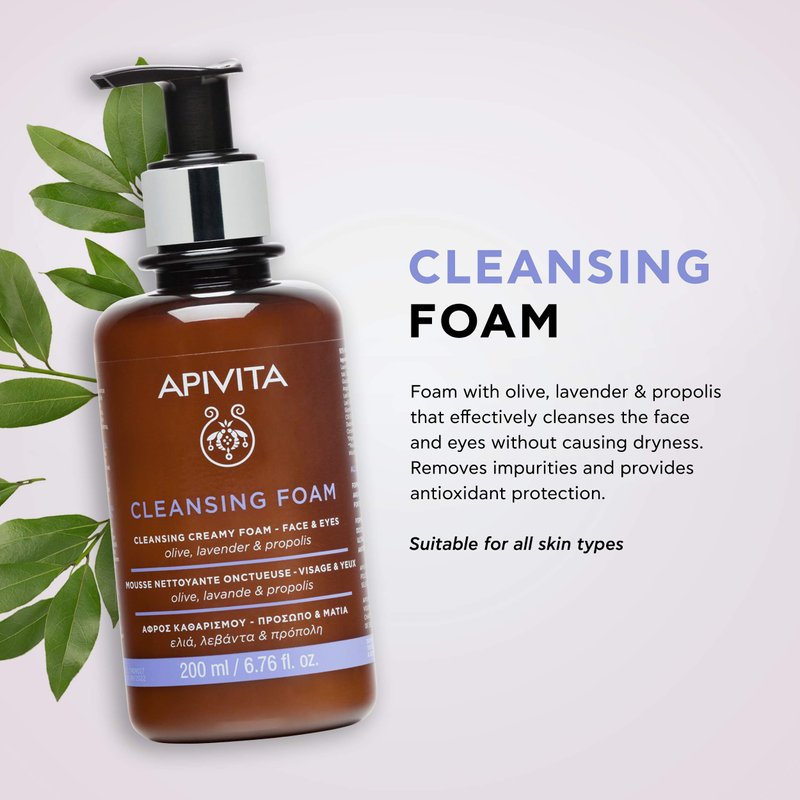 APIVITA Cleansing Foam for Face & Eyes - Removes Makeup & Impurities, Soothing, Hydrating, Revitalizing, Moisturizing Organic Facial Wash, 6.76 Fl Oz