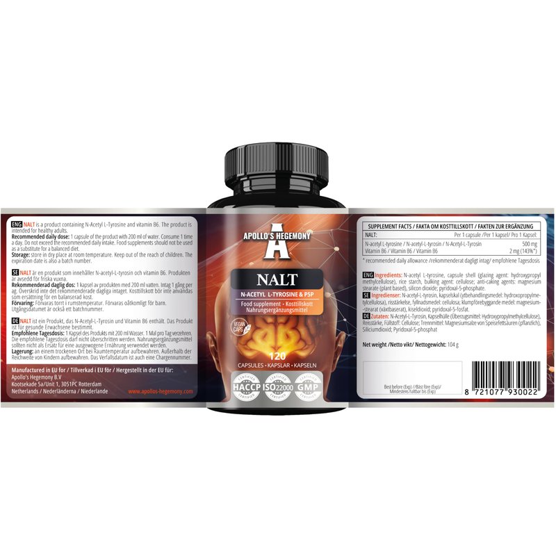 Apollo's Hegemony N-Acetyl-L-Tyrosine (NALT) 500mg and Active Vitamin B6 (P-5-P) 2mg - 120 Capsules - 4 Months Supply - High Strength Amino Acid Supplement - Cognitive Booster