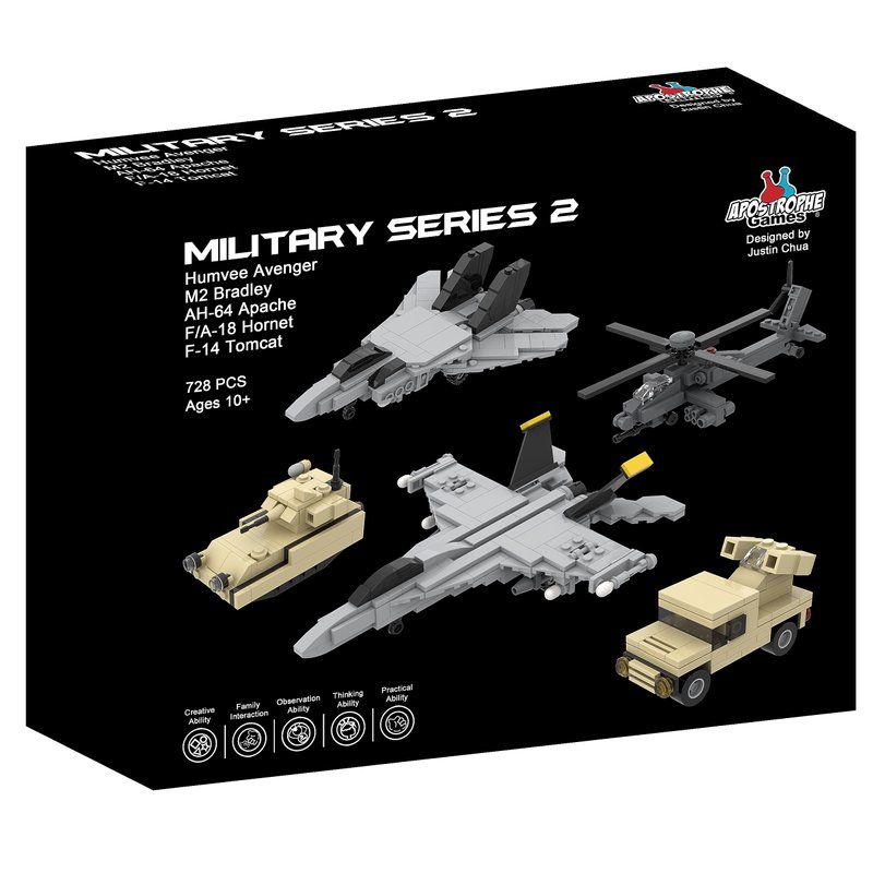 - Each vehicle has movable parts!: F/A-18 Hornet combat aircraft, F-14 Tomcat fighter jet, AH-64 Apache Helicopter, M2 Bradley tank, and Humvee Avenger air defense system