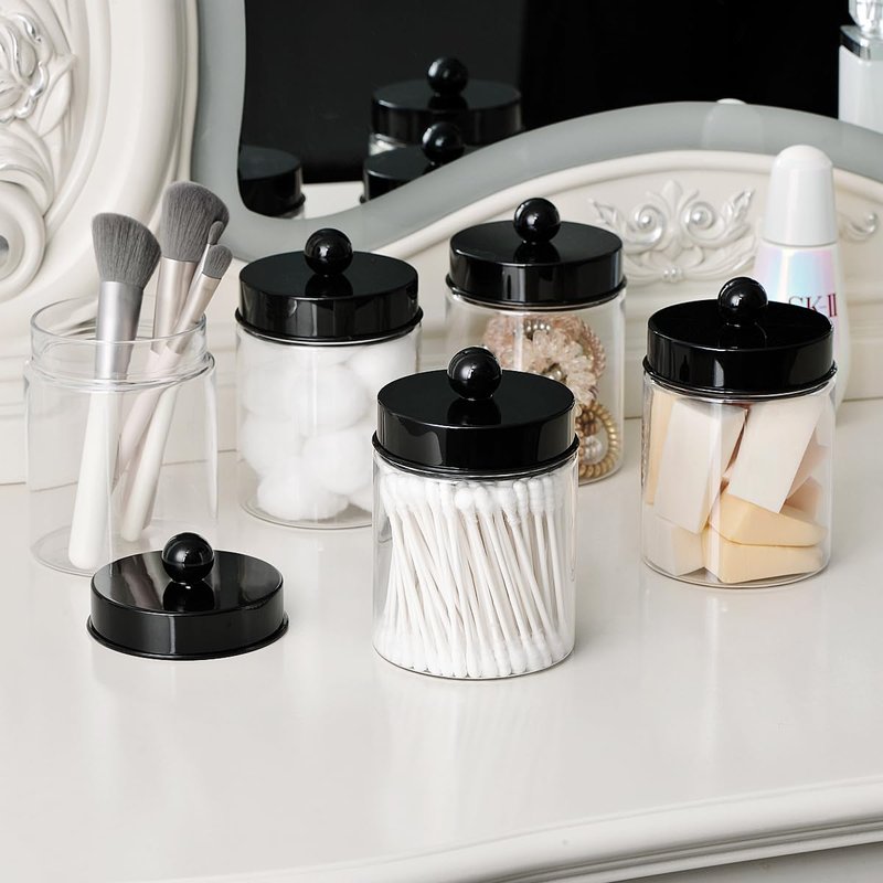 - ✅ IDEAL STORAGE CONTAINERS - The apothecary storage jars are an attractive way to organize items. Perfect organizer for Qtip, cotton ball, cotton swab pad, cotton rounds, floss picks, tampon, bath salts, hair tie band, makeup brush, beauty egg, face brush, crayons, candy, pens,holds hair ties, clips, elastic bands, bobby pins, bows and more. They look cute,useful,light, simple,safe and modern, keep things organized.