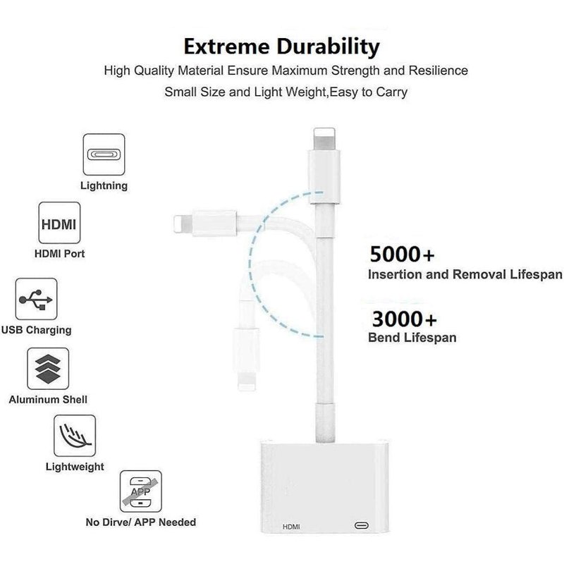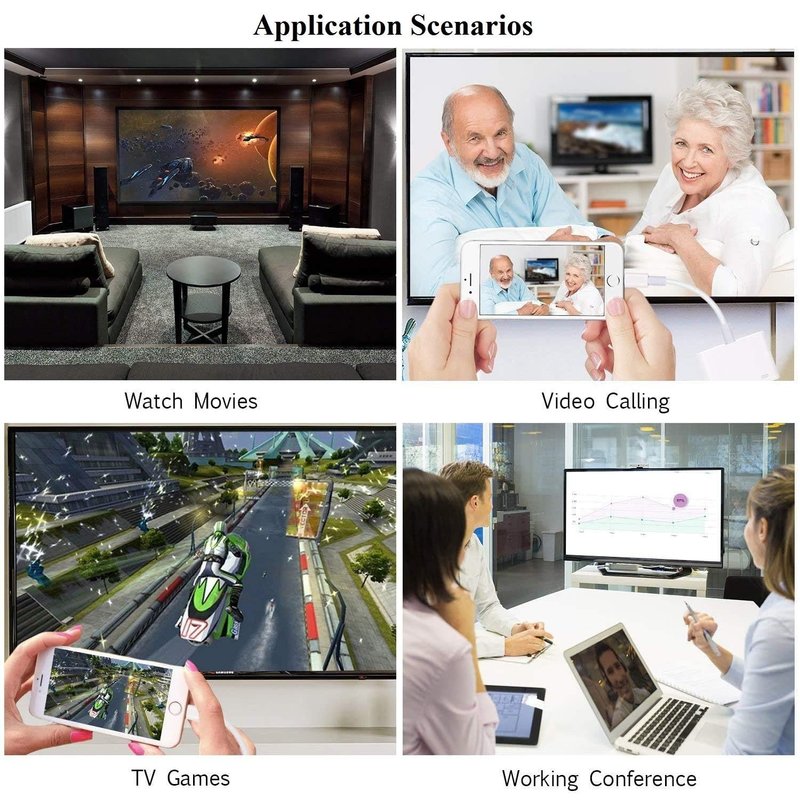 - 【1080P Lightning Digital AV Adapter】 The apple lightning to HDMI adapter supports mirroring of what is displayed on your device screen, including presentations, slideshows, websites, apps and more to your HDMI equipped TV, display, projector or other compatible display in resolutions up to 1080P HD. The apple lightning to HDMI adapter provides a superb visual feast in everyday life and work.