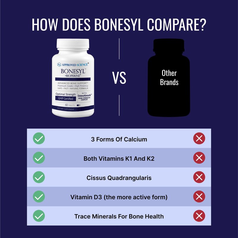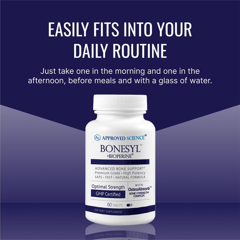 Approved Science Bonesyl strengthens the entire skeletal system with ingredients that are crucial for reforming calcium in the bones. Limit the risk of bone loss, bone density, and ensure the body maintains healthy calcium Levels. Formulated with BioPerine to boost absorption and for faster, more effective results.
