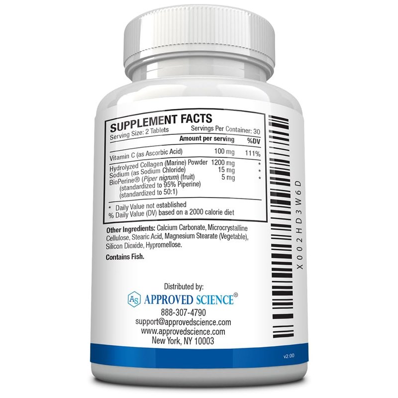 Approved Science Collagen Pills - Absorbable Marine Collagen Types I and III - 180 Tablets - Healthy Hair, Skin, and Joints - Vitamin C, Sodium, and Bioperine for Fast Results - Non-GMO, Made in USA