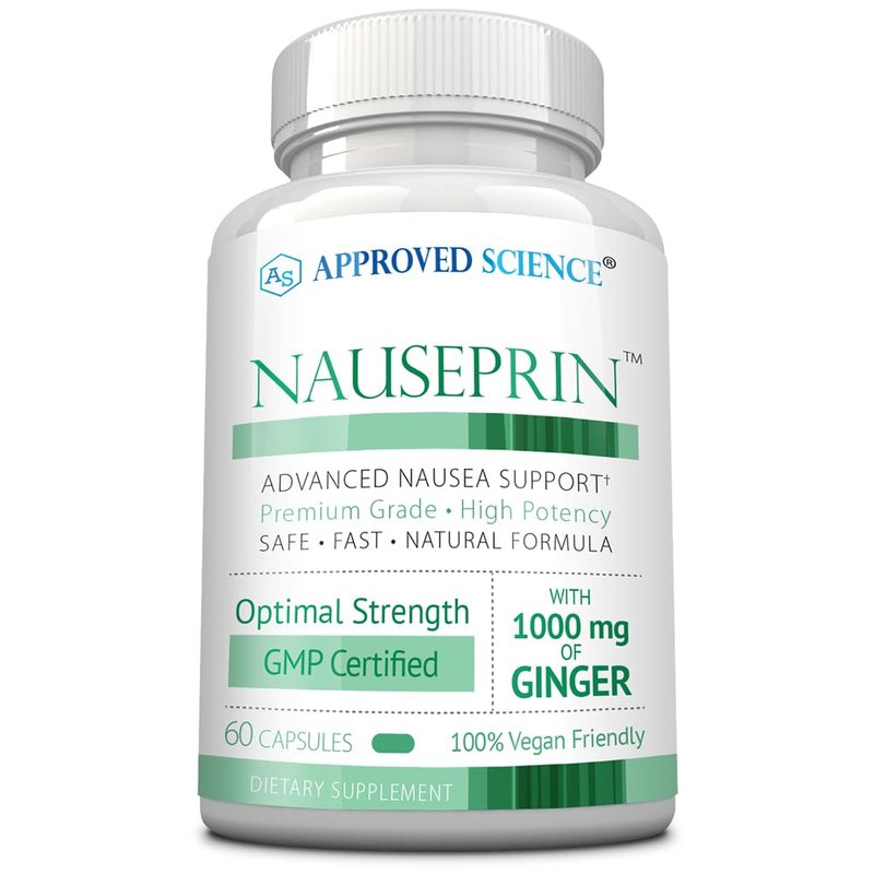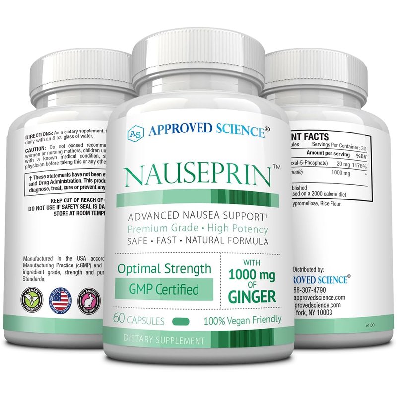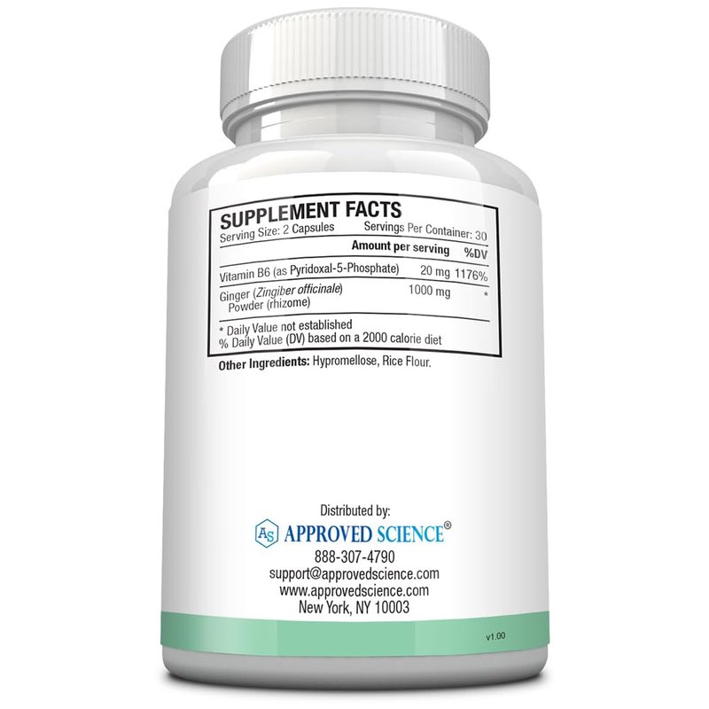 Approved Science Nauseprin is a scientifically formulated supplement designed to address nausea. Our unique blend combines 1000 mg of Ginger with 20 mg of Vitamin B6, to help ease nausea, diminish vomiting, and provide a soothing effect on the stomach. By utilizing the most bioavailable form of Vitamin B6, Pyridoxal-5-Phosphate, our formula helps to effectively raise B6 levels in the body, for longer-lasting freedom from nausea. Non-GMO, vegan, and made in the USA.