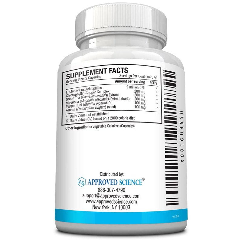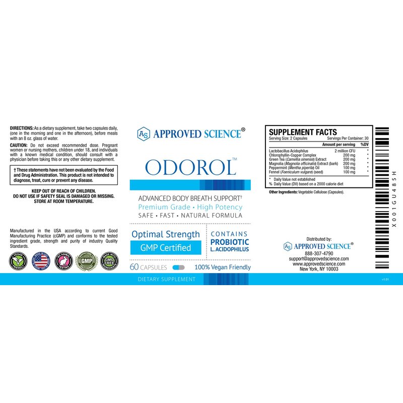 Approved Science Odorol - 60 Capsules - Freshen Bad Breath and Body Odor - Contains L.acidophilus, Green Tea, Magnolia Bark, Peppermint Oil, and Fennel - All Natural, Vegan Friendly, Non-GMO