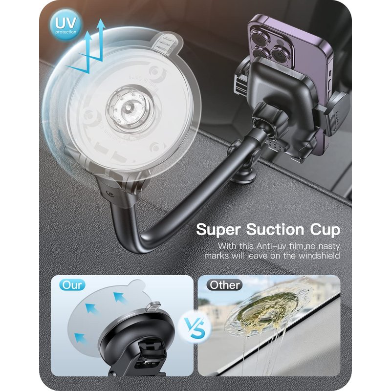- Double Support Points: With its strong suction cup and anti-shake stabilizer, this truck phone mount will keep your phone securely in place, even on the bumpiest of roads