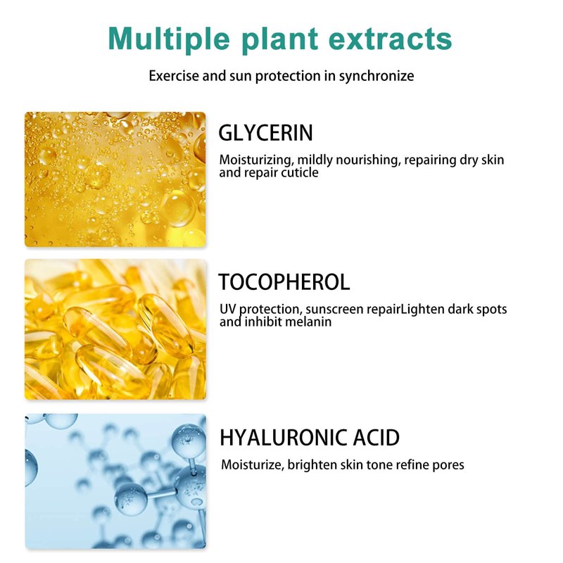 - Jelly sunscreen mask contains glycerin, tocopherol (vitamin E), hyaluronic acid, these ingredients can effectively moisturize, gently nourish, repair dry skin, brighten skin tone, refine pores, repair stratum corneum, protect against UV rays, lighten dark spots.